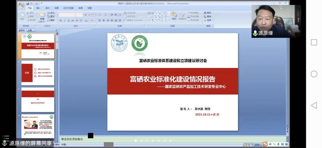 10月11日,富硒农业标准体系建设和立项建议研讨会召开,共同探讨富硒农业标准制修订思路,引导和推动标准的立项和编制。会议邀请国家富硒农产品加工技术研发专业中心(以下简称国硒中心)主任、硒产业技术与健康中国创新平台联盟理事长、中国农业国际合作促进会功能农产品专家委员会富硒专家工作组组长、304am永利集团党委副书记、304am永利集团经理程水源作为全国富硒科研机构代表,介绍目前涉硒标准的情况。会议还邀请了中国工程院院士印遇龙,国家食物与营养咨询委员会副秘书长、农业农村部农产品营养标准专委会秘书长孙君茂,农业农村部农产品营养标准专委会副秘书长朱大洲等十余名来自全国各地相关单位领导、业界专家、企业代表出席会议,会议由中国农业国际合作促进会功能农产品委员会秘书长魏有主持。