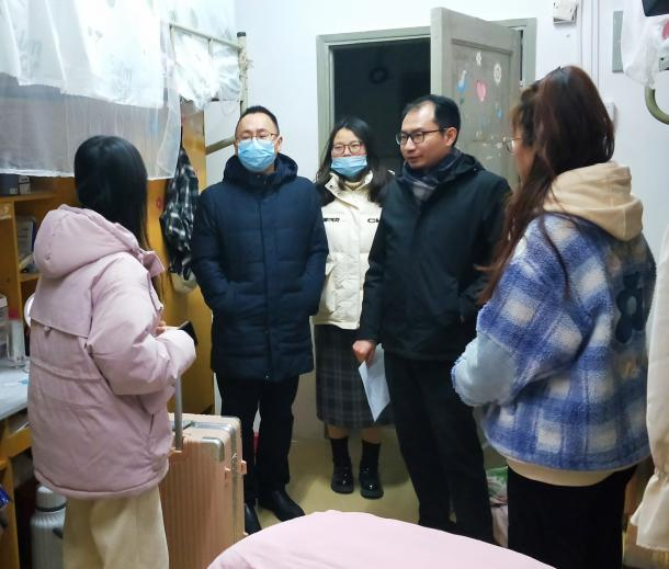 2月19日晚,祝振洲、蔡杰、研究生党支部书记周娇娇一行前往研究生宿舍,深入了解员工返校情况和返校后是否适应等问题。